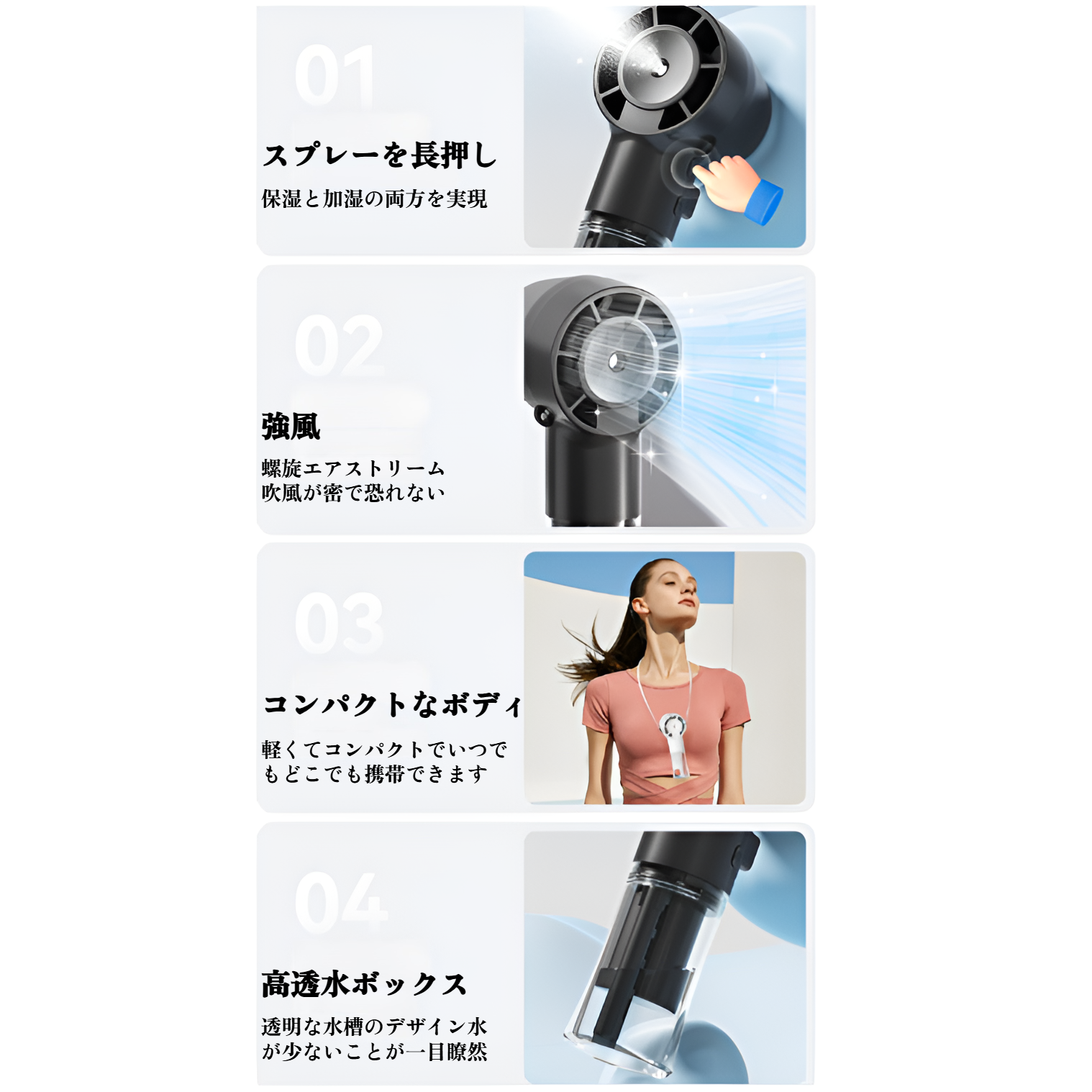 携帯扇風機 ハンディファン 手持ち扇風機 充電式 加湿器 USB扇風機 小型 静音 風量調節 手持ち 卓上 首掛け せんぷうき ミニファン 熱中症対策